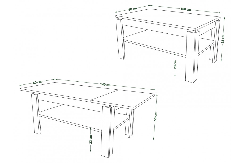 Odświeżona odsłona klasycznego już modelu, który doskonale sprawdzi się jako stolik kawowy do salonu. Blat tego stolika można bardzo szybko powiększyć do 140 cm, dzięki czemu niezapowiedziana wizyta gości nie będzie już żadnym problemem. Dodatkowo przestronna półka sprawi, że najpotrzebniejsze rzeczy będą zawsze w zasięgu ręki.