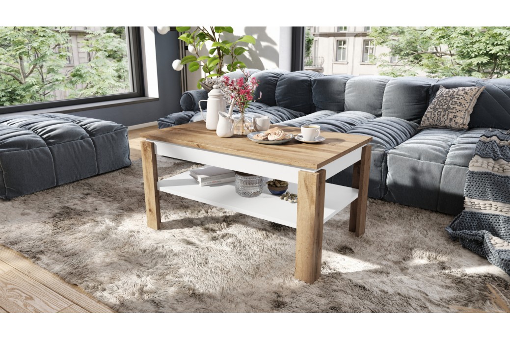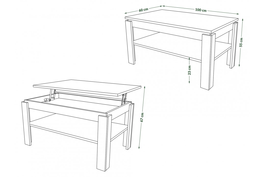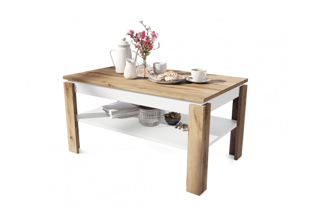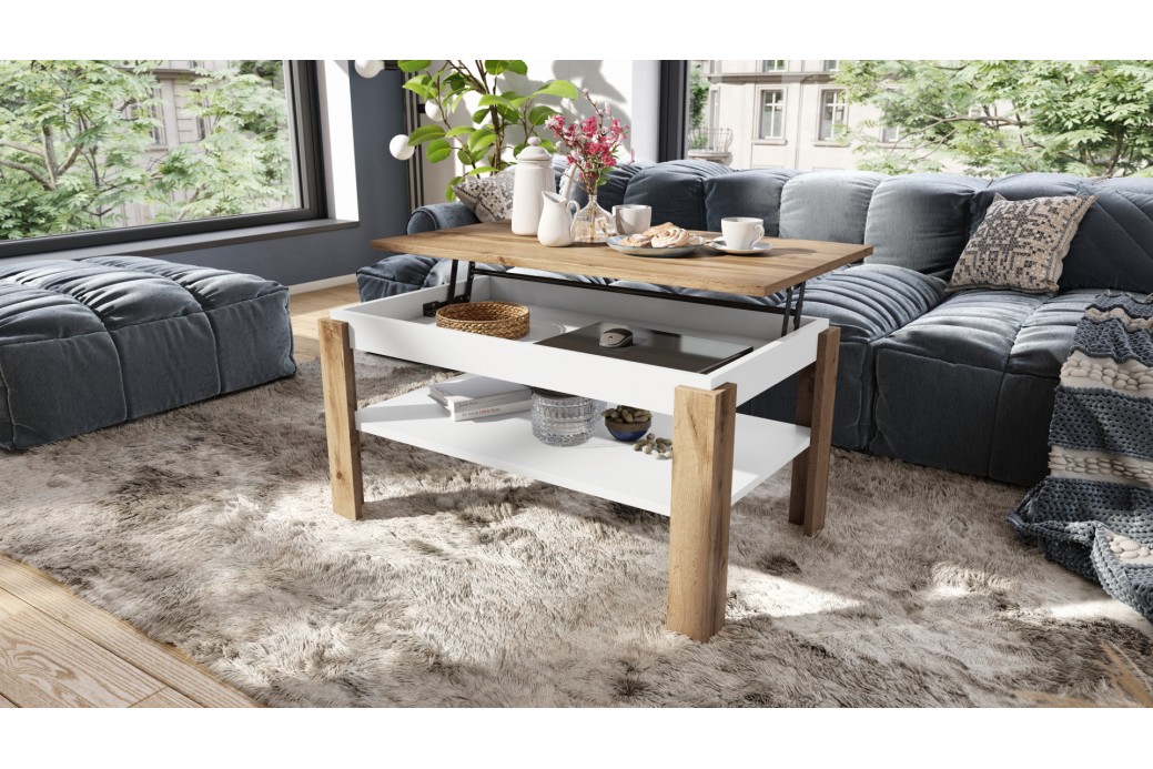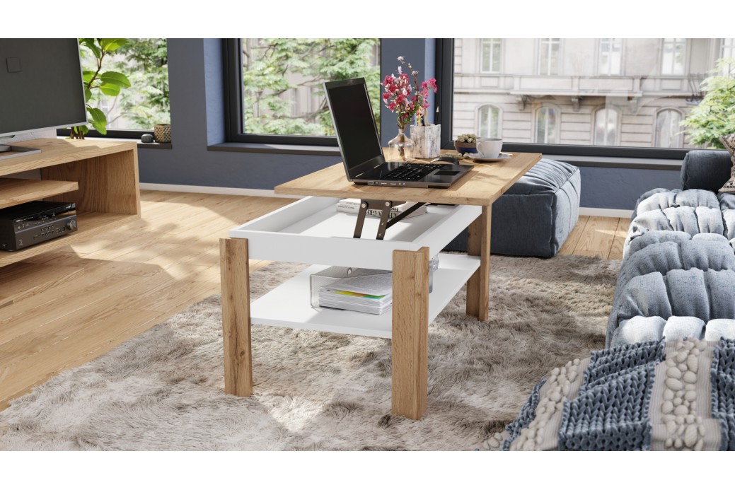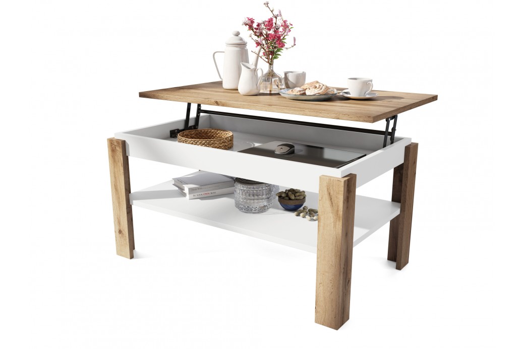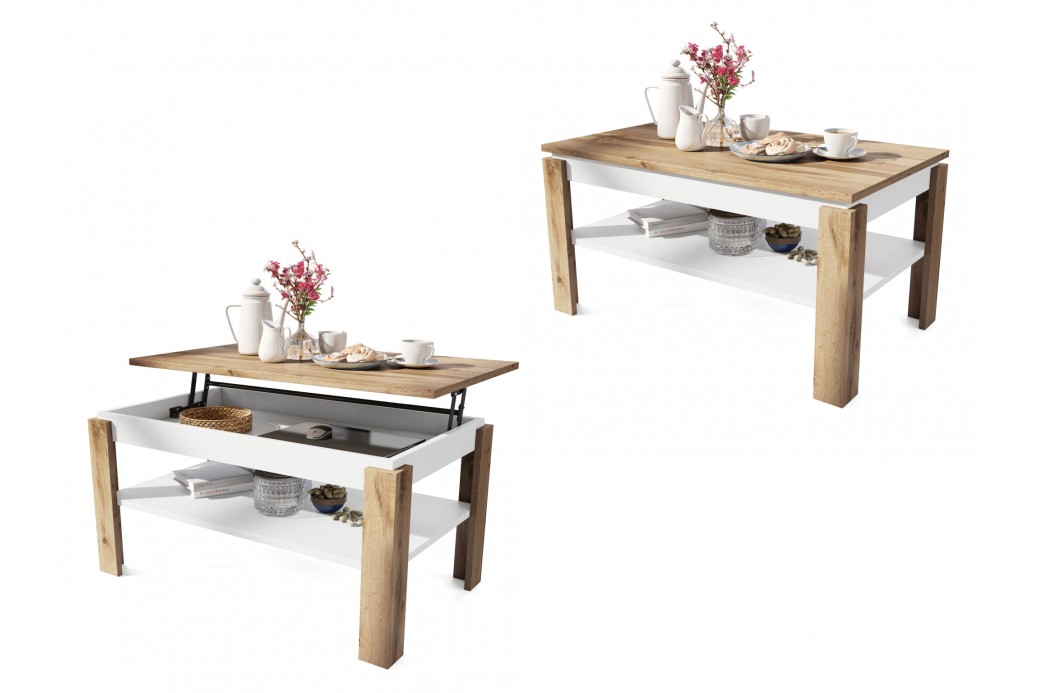 Nowa odsłona klasycznego już modelu, który doskonale sprawdzi się jako stolik kawowy do salonu oraz rozkładany stolik służący do pracy z laptopem, a także wygodnego zjedzenia posiłku. Wszystko za sprawą mechanizmu umożliwiającego podniesienie blatu, ukrytego w schowku pod nim, który dodatkowo można wykorzystać do przechowywania najpotrzebniejszych rzeczy.