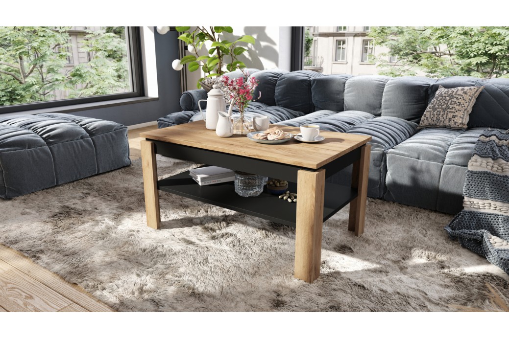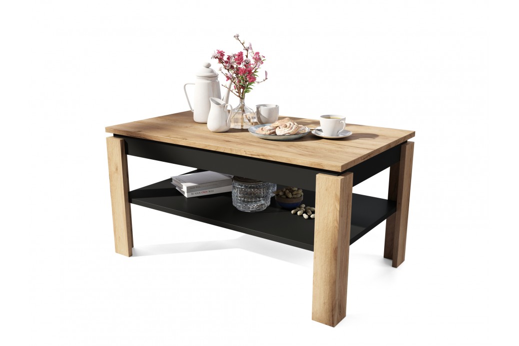 Nowa odsłona klasycznego już modelu, który doskonale sprawdzi się jako stolik kawowy do salonu oraz rozkładany stolik służący do pracy z laptopem, a także wygodnego zjedzenia posiłku. Wszystko za sprawą mechanizmu umożliwiającego podniesienie blatu, ukrytego w schowku pod nim, który dodatkowo można wykorzystać do przechowywania najpotrzebniejszych rzeczy.
