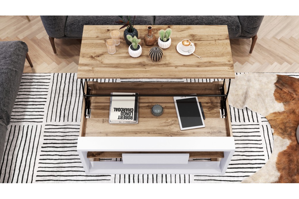 FRAME to elegancka i funkcjonalna ława, idealna do salonu lub biura posiadającego kącik dla gości. Jej podnoszony blat umożliwia wygodne spożywanie posiłków czy też pracę z laptopem lub po prostu wypicie herbaty/kawy w sposób nie wymagający podnoszenia się z kanapy, zapewniając przy tym maksymalny komfort użytkowania. Designerska ramka z prostokątnym elementem dekoracyjnym w środku sprawiającym wrażenie lewitującego, przykuwa oko i nadaje meblowi wyjątkowego charakteru. Ława wyposażona jest dodatkowo w praktyczny schowek pod blatem oraz przestronna półkę na dole, dzięki którym najpotrzebniejsze rzeczy będą zawsze w zasięgu ręki. Ława FRAME to połączenie estetyki i funkcjonalności, które sprawią że Twój salon czy też biuro będą wyjątkowo przytulne i ergonomiczne.